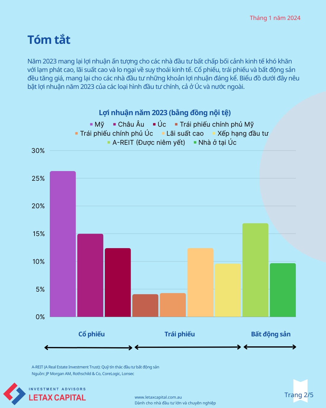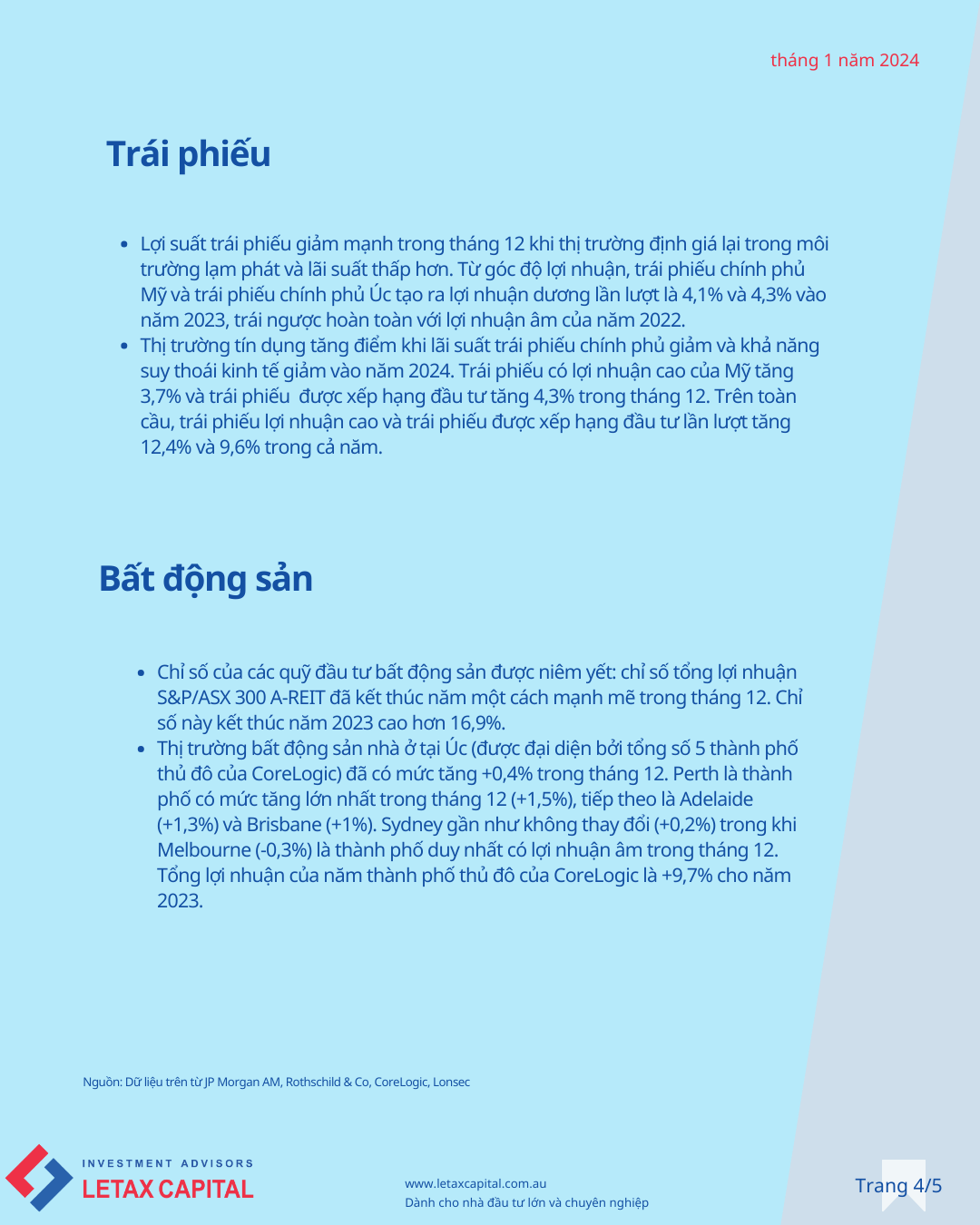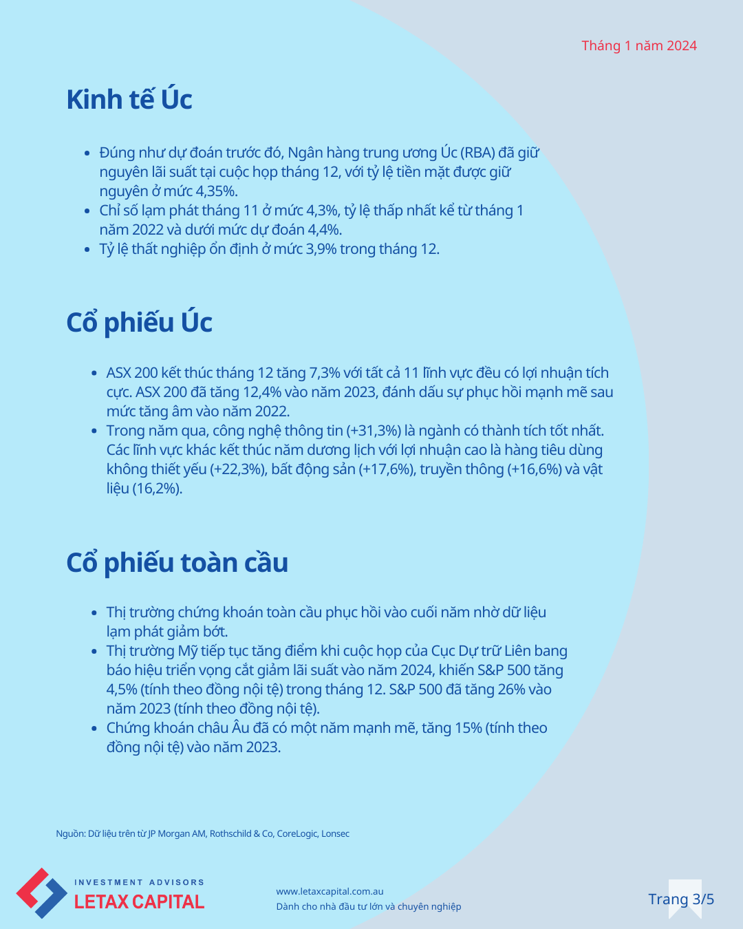 30/01/2024 Bản tin Đầu tư- Tháng 1/2024 Viết bình luận của bạn: Gửi bình luận Tin tức xem nhiều Bản tin đầu tư tháng 1/2025 Hội thảo Đầu tư Úc cho các nhà đầu tư Việt Nam tháng 4/2024 Bản tin Đầu tư- Tháng 4/2024 Bản tin Đầu tư- Tháng 1/2024