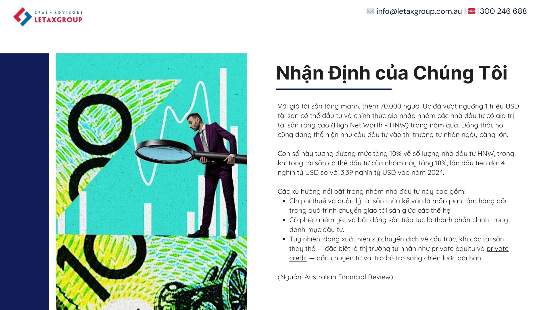 27/01/2026 Nhà Đầu Tư Với Giá Trị Tài Sản Ròng Cao - Xu Hướng Gia Tăng Đầu Tư Vào Thị Trường Tư Nhân Viết bình luận của bạn: Gửi bình luận Tin tức xem nhiều Nhà Đầu Tư Với Giá Trị Tài Sản Ròng Cao - Xu Hướng Gia Tăng Đầu Tư Vào Thị Trường Tư Nhân Tiệc Cuối Năm và Quà Tặng: Thuế Phụ Bổng (FBT) và Các Vấn Đề về Thuế Tín Dụng Tư Nhân - Case Study Tín Dụng Tư Nhân: Cơ Hội, Rủi Ro Và Triển Vọng Tại Úc